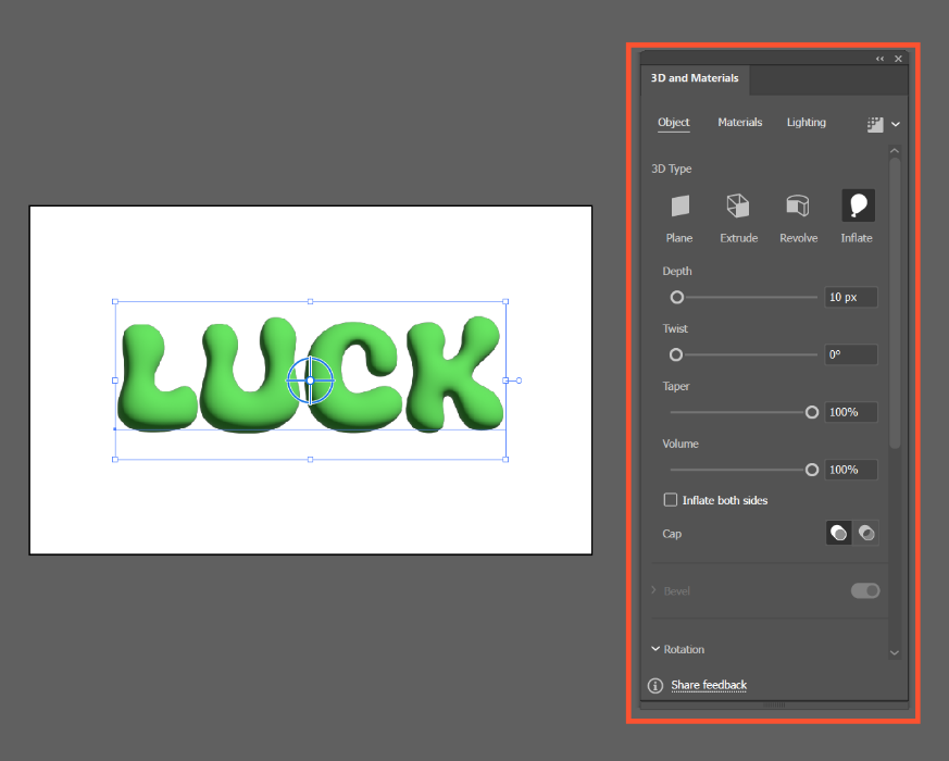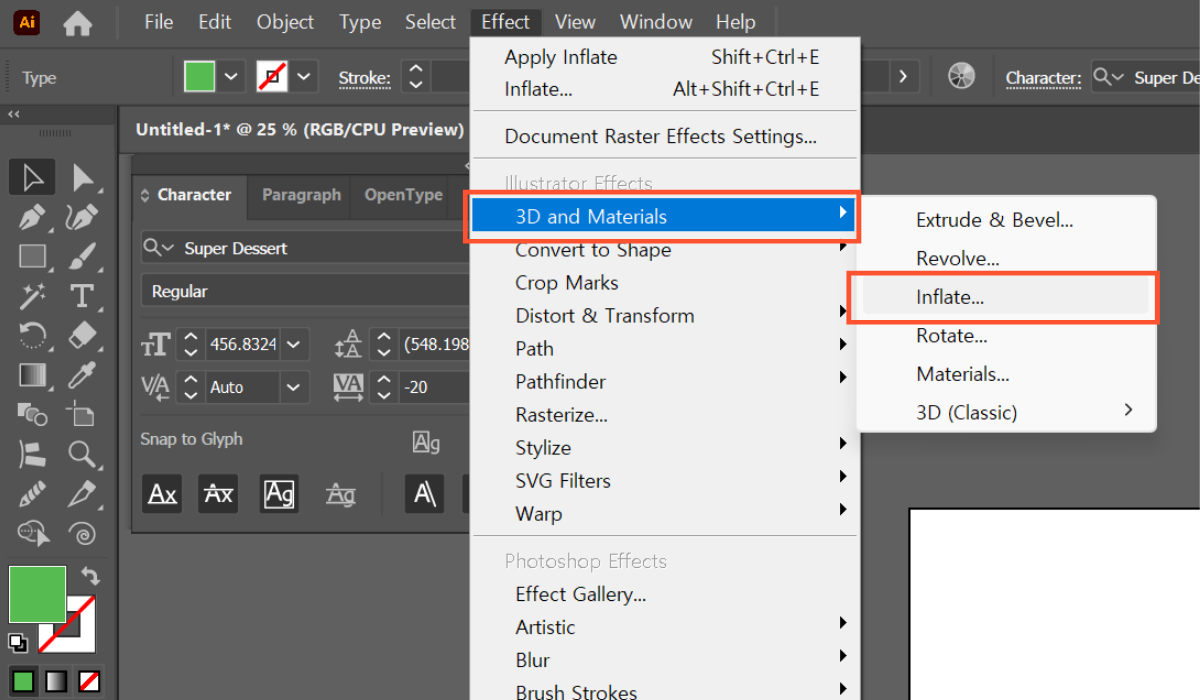 개체를 선택한 상태에서 상단 메뉴 Effect → 3D and Materials → Inflate(부풀리기) 클릭합니다. 그러면 선택한 개체가 풍선처럼 통통한 모양으로 변한 걸 볼 수 있어요. 확실히 입체감이 생기면서 퀄리티가 확 올라가죠?